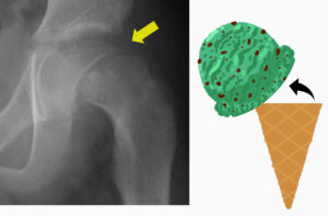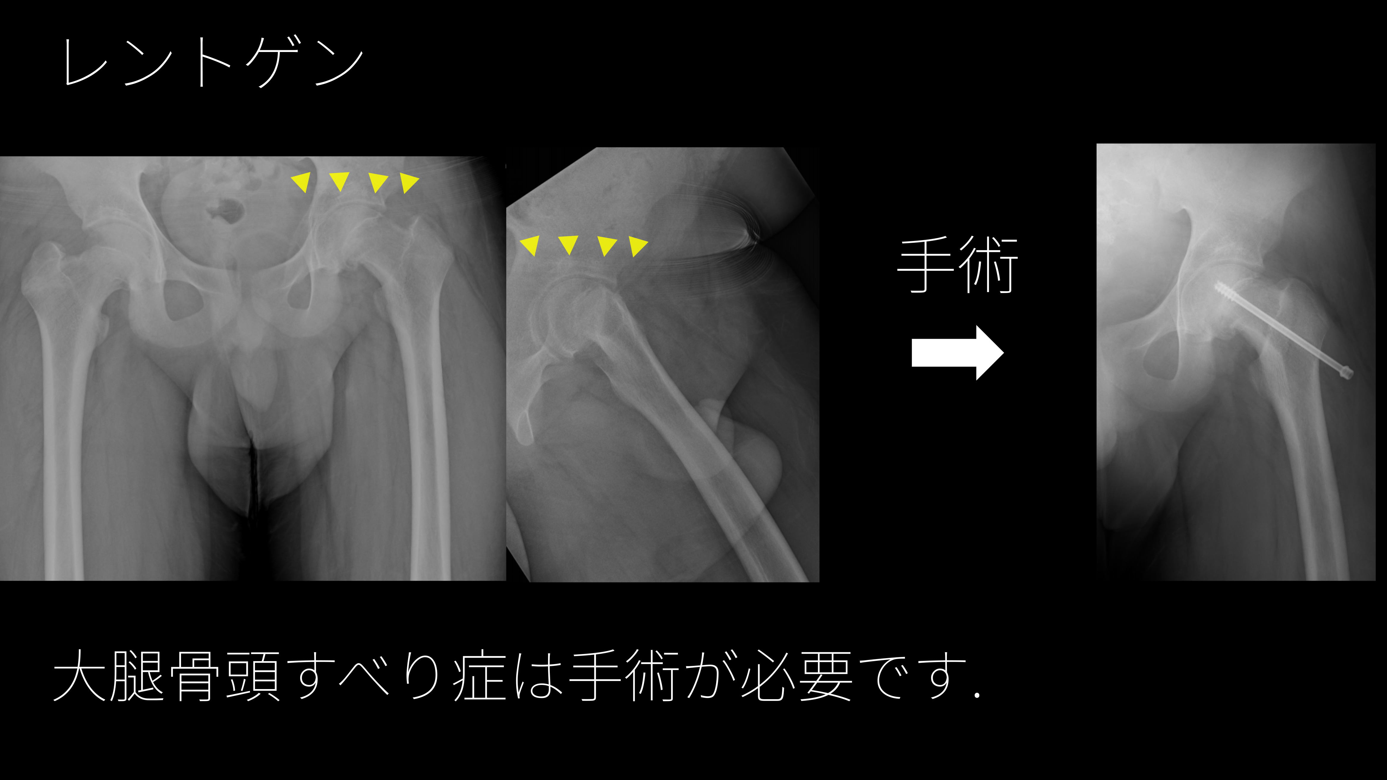 骨の成長線のところ(矢印)で大腿骨頭がずれることで痛みや跛行の原因となります。