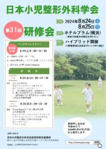 日本小児整形外科学会 第31回研修会(ハイブリッド開催)概要会期2024年8月24日(土)13:00~17:35 (ハンズオンレクチャー 9:00~12:00 60名定員制) 8月25日(日)09:00~15:30会場ホテルプラム(横浜)またはWeb配信 〒220-0004 神奈川県横浜市西区北幸 2-9-1 TEL: 045-314-3111 (現地参加120名まで)募集人数現地参加:120名まで(ハンズオンレクチャー参加者優先) ハンズオンレクチャー60名(先着順) Web:定員なし※ハンズオンレクチャーのみの受付はありません参加費ハンズオンレクチャー:5,000円(現地決済) 研修会:会員20,000円 非会員30,000円(教材費含む・事前決済)申し込みhttps://square.umin.ac.jp/jpoakenshu/プログラムPDF・研修会は、現地参加を120名に限定させていただき(ハンズオン・レクチャーに参加される方を優先)、それ以外の先生はwebでご参加いただく予定です Webでご参加いただく先生には、テキストはPDFにて配布させていただく予定です ・懇親会については8/24の全セッション終了後に開催予定です(参加費5,000円、現地決済) プログラム一日目 8月24日(土)9:00~12:00ハンズオンレクチャーAグループ 定員20人ITB 療法 (協賛企業:第一三共)講師 金城 健(沖縄県立南部医療センター) 藤井宏真(奈良県立医科大学) 青木 恵(弘前大学) 大島洋平(東鷲宮病院)Bグループ 定員20人DDH の牽引療法・ギプス(協賛企業:シグマックス)講師(牽引) 服部 義(あおぞらファミリークリニック) 塚中真佐子(滋賀県立小児保健医療センター)講師(ギプス) 金 郁喆(宇治武田病院) 青木 清(旭川荘療育・医療センター) 川口泰彦(東京慈恵会医科大学附属第三病院) 大庭真俊(神奈川県立こども医療センター)Cグループ 定員20人創外固定 (協賛企業:Smith & Nephew)講師 田村太資(大阪母子医療センター) 小松繁允(宮城県立こども病院) 垣花昌隆(獨協医科大学埼玉医療センター) 江口佳孝(国立成育医療研究センター) 岡 佳伸(京都府立医科大学)13:00研修会開会挨拶 小林直実(教育研修委員会委員長)13:10※①小児足部疾患垣花昌隆(獨協医科大学埼玉医療センター)14:10※②ビデオレクチャーで学ぶエコー ①上肢エコー仲西康顕(奈良県立医科大学)②膝エコー中瀬順介(金沢大学) 15:15休憩15:30※③アフタヌーンセミナー (協賛:アレクシオンファーマ) ①小児の骨脆弱性疾患 血液検査のススメ坂本優子(順天堂大学医学部附属練馬病院)②遺伝性疾患を有する小児期患者の運動機能評価と理学療法士との連携の意義西澤公美(信州大学)16:35※④臨床研究基礎講座①研究倫理 田野島玲大(横浜市立大学)②英語論文の書き方 崔 賢民(横浜市立大学)17:35終了2日目 8月25日(日)9:00※⑤Case Report から学ぶ難治例治療①下肢形成不全 小松繁允(宮城県立こども病院)②上肢形成不全 花香 恵(札幌医科大学)10:05※⑥放射線防護山下一太(徳島大学)11:10※⑦コンプリケーションとピットフォール ①上下肢外傷入江太一(仙台市立病院) ②脊椎(外傷を含む)柳田晴久(福岡市立こども病院)12:20ランチョンセミナー(協賛:コニカミノルタ/エム・シー・メディカル)小児に対するエコーを活用した整形外科診療面谷 透(東京先進整形外科)13:20休憩13:35シンポジウム 『ペルテス病』座長:中村直行(神奈川県立こども医療センター)1. 基礎 黒柳 元(名古屋市立大学)2. 画像診断 野崎太希(慶應義塾大学)3. 病院治療 山口亮介(九州大学)4. 肢体不自由児施設併設型こども病院 水野稚香(宮城県立こども病院)5. 成人股関節外科医から見たペルテス病 三浦陽子(船橋整形外科病院)15:30閉会※2日間で合計7単位が取得可能となる予定です。Webで参加される方は単位取得に顔出しが必要です また認定医申請に必要な受講証取得については、全てのセッションで顔出しが必要ですのでご注意ください