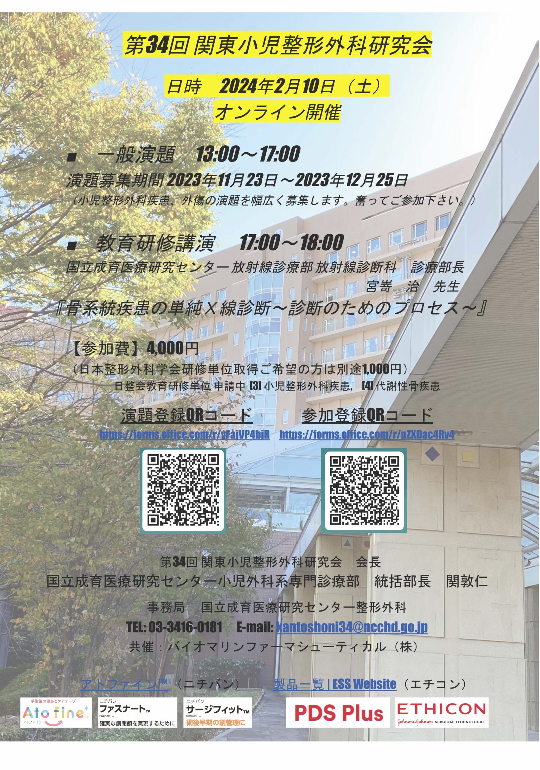〒157-8535 東京都世田谷区大蔵2−10−1 Tel 03-3416-0181 Fax 03-3416-2222 E-mail kantoshoni34@ncchd.go.jpプログラム13:00-17:00一般口演 (詳細は後日掲載)17:00-18:00特別講演 日整会専門医 N申請中「骨系統疾患の単純X線診断〜診断のためのプロセス〜」 演者:国立成育医療研究センター 放射線診断科 診療部長 宮嵜 治登録(演題登録および参加登録)演題登録 https://forms.office.com/r/yFajVP4bjR 参加登録 https://forms.office.com/r/pZXDac4Rv4