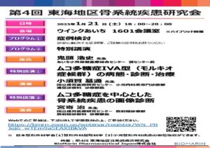 第4回東海地区骨系統疾患研究会開催のお知らせ2022/11/16Posts by webmaster会期2023年 1月21日(土) 18:00~20:00会場ウインクあいち 1601会議室※ハイブリッド開催詳細・参加登録は下記チラシ(PDF)をご確認ください