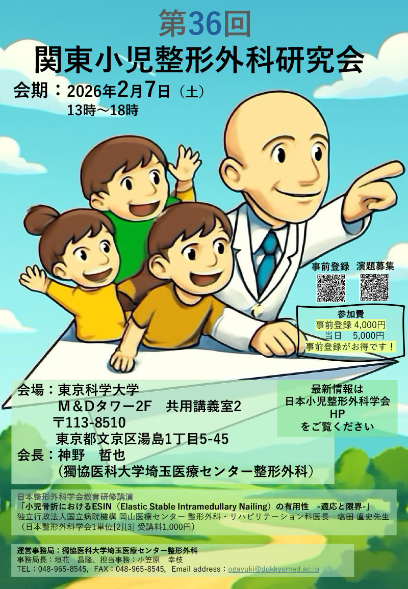 第36回関東小児整形外科研究会 運営事務局 会長:神野 哲也(獨協医科大学 埼玉医療センター 整形外科) TEL:048-965-8545 Email address:ogayuki@dokkyomed.ac.jp