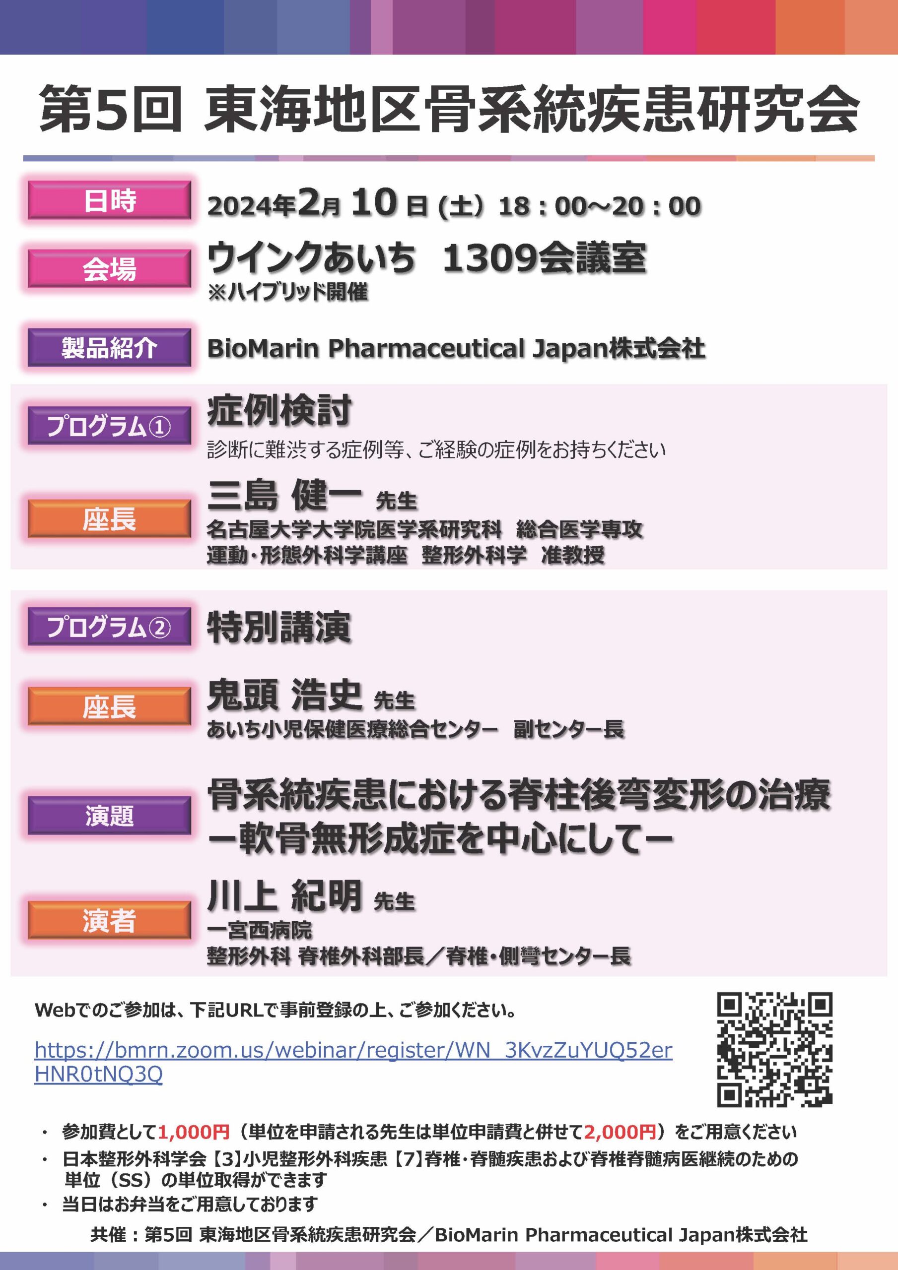 第5回東海地区骨系統疾患研究会開催のお知らせ2023/11/30Posts by webmaster会期2024年2月10日(土) 18:00~20:00会場ウインクあいち 1309会議室※ハイブリッド開催詳細・参加登録は下記チラシ(PDF)をご確認ください